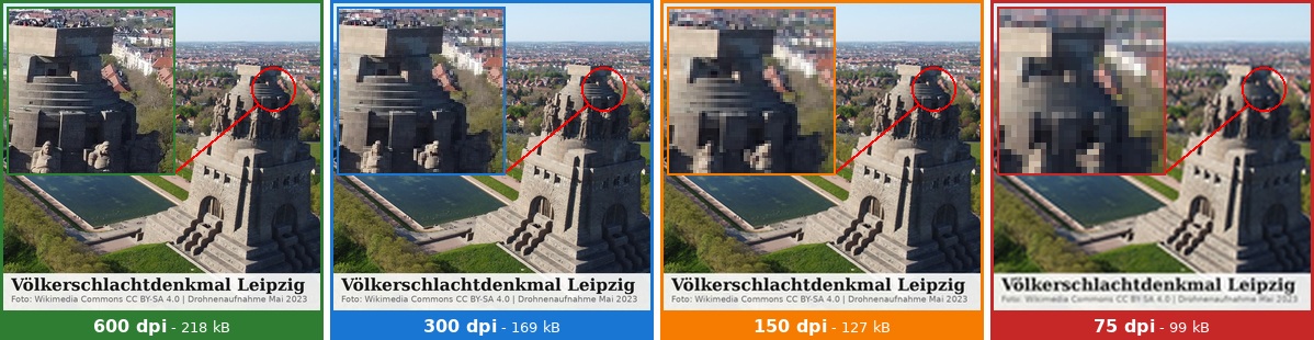 .Obrázek jasně ukazuje vliv různých úrovní kvality (dpi) souboru PDF. Malý výřez vlevo nahoře ukazuje zvětšení výřezu, které simuluje velmi blízký pohled na vytištěný soubor (nebo zvětšení na obrazovce). Následující srovnání pomáhá lépe posoudit různé úrovně DPI a velikosti souborů.
